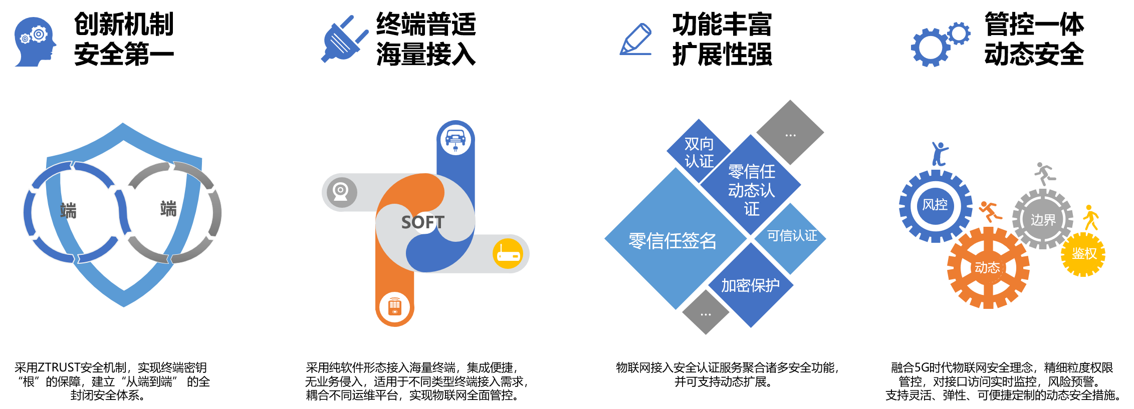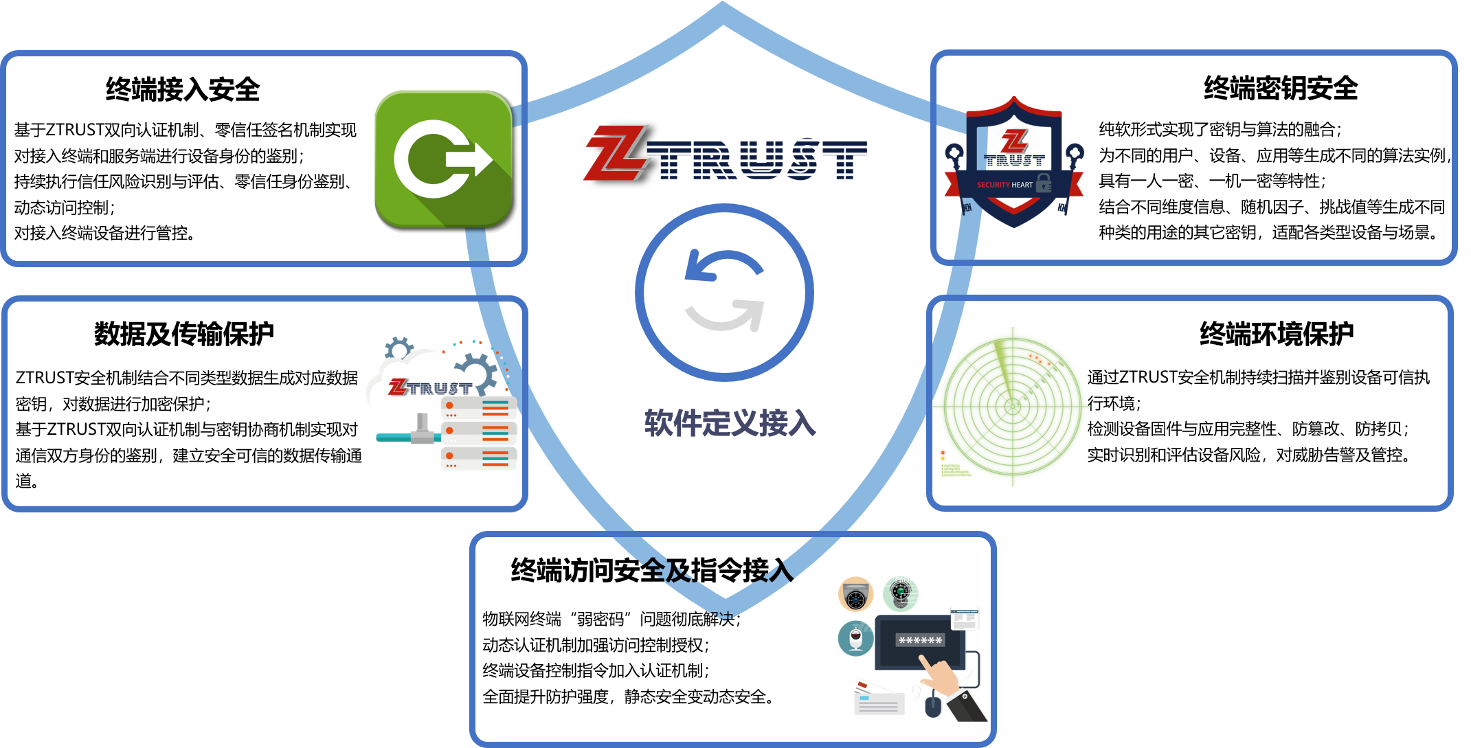 物联网安全离不开密码的核心保障和基础支撑,海量安全以全新的ZTRUST安全机制引领物联网安全的发展方向,实现物联网与密码深度融合创新,应对物联网风险新挑战,真正把安全、放心、智能、便捷的物联网带给每一个人、每一个家庭、每一个组织。